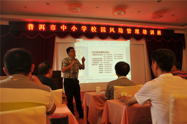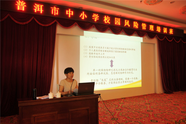 為認(rèn)真貫徹落實(shí)《云南省教育廳關(guān)于舉辦中小學(xué)校園風(fēng)險(xiǎn)管理培訓(xùn)班的通知》(云教函[2015]317號)文件精神,進(jìn)一步加強(qiáng)普洱市學(xué)校安全教育和管理工作,切實(shí)提高基層學(xué)校風(fēng)險(xiǎn)防控的能力,于2015年8月25日舉辦了義務(wù)教育階段學(xué)校校園風(fēng)險(xiǎn)管理培訓(xùn)班。我公司特邀請專業(yè)律師和保險(xiǎn)專家,組成培訓(xùn)小組,對參訓(xùn)人員進(jìn)行了培訓(xùn)。專業(yè)律師和保險(xiǎn)專家圍繞依法治校、安全管理方法、法律風(fēng)險(xiǎn)規(guī)避方法、教育風(fēng)險(xiǎn)及風(fēng)險(xiǎn)管理辦法、保險(xiǎn)法等內(nèi)容展開了詳細(xì)的講解。我公司業(yè)務(wù)總監(jiān)羅琳對2014學(xué)年受理的校方責(zé)任保險(xiǎn)案例作了詳盡的分析,并提出了相關(guān)風(fēng)險(xiǎn)管理建議。她指出,我省校園安全責(zé)任事故類型主要以意外傷害事故為主,因此加強(qiáng)安全與防范教育以及校園課間管理尤為重要。客服部鄧曉麗詳細(xì)解釋了《云南省教育廳等四部門關(guān)于加強(qiáng)學(xué)校保險(xiǎn)工作的指導(dǎo)意見》(云教體[2014]26號)中所列的險(xiǎn)種,并提出了相關(guān)建議。